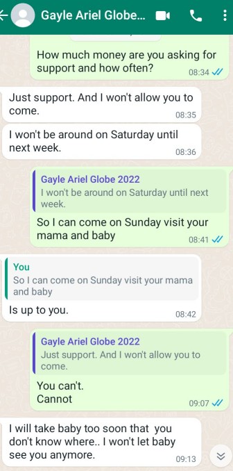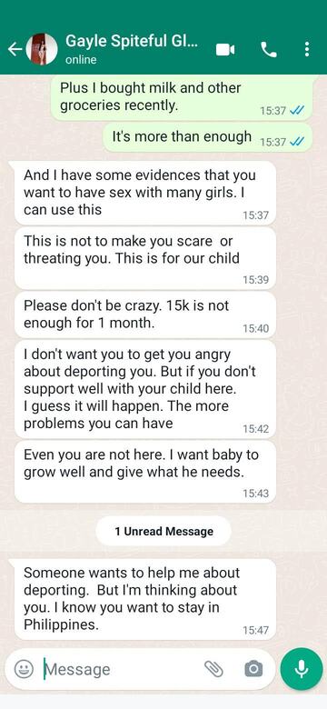 Since then, her harassment only intensified. She was sending me messages that she won't let the baby see me anymore, and multiple threads that she will deport me.