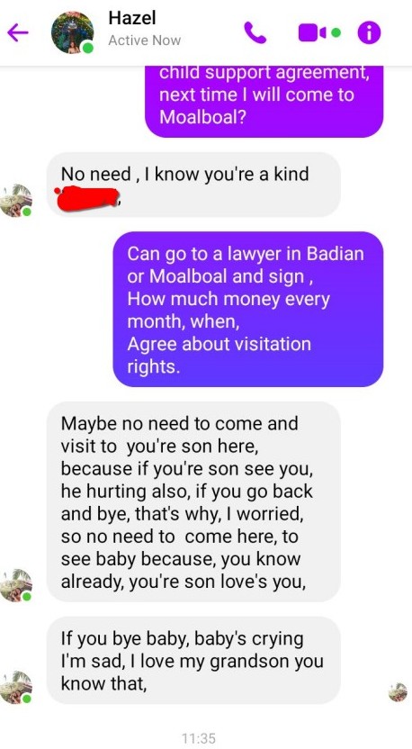 I'm not the problem here: many people who know me well confirm that I'm the "nice" guy. One of the main sources of the problem is giving a little narcissistic girl the power to use lawyers as a cat's paw for her revenge because I no longer want to marry her. (Among the many girls I met in Asia, she turned out to be the worst. My bad for impregnating her. The greater fool will be the sucker who marries her). Secondly, she doesn’t want me around the child because her relationships are built on lies, and it would be more difficult for her to persuade gullible (mostly) foreigners to sponsor her. One of her fears is that, during unsupervised visitations, my girlfriend could help me take care of the child. (Did I mention the baby mama was dating multiple men, often hiding them from me, usually blocking me on social media when she was in "dating mode", but sometimes sending me photos showing that the baby has a "new father" as her way of disrespecting me?) And, definitely, there are communication issues. Her mother, Hazel, 40+, has communication skills on a teenage level. She used to write me messages in her native language when she got angry. (Google Translate usually made little sense of her messages.) She also had a habit of unsending messages if I didn't respond promptly after she sent them. Just recently, she unblocked me, called me, but I didn't respond, and she blocked me again. Both Hazel and Gayle often block me on social media.