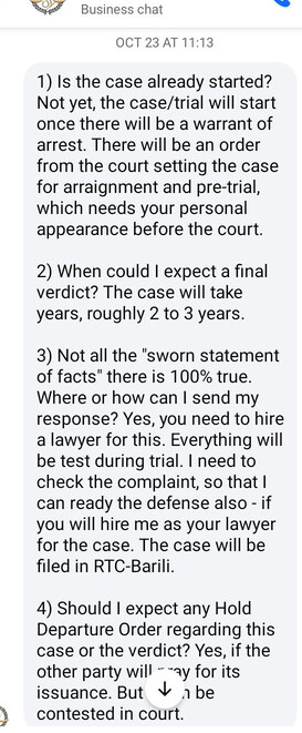 Lawyers are only happy for such cases against foreigners. They also have families and children. All for the "best interest of the children". Maybe lawyers' children? . In Moalboal, they quoted me ₱80k just for the acceptance fee. They informed me that if the prosecutor decides to file the case in court, a warrant of arrest will be issued. And the case will take roughly 2 to 3 years.